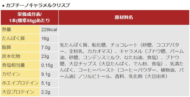 Color原材料乳たんぱく質、転化糖、チョコレート(砂糖、ココアバター、全粉乳、カカオマス)、キャラメル(ブドウ糖、パーム油、砂糖、コンデンスミルク、なたね油、食塩)、ブドウ糖、大豆チップス(大豆たんぱく、でん粉、食塩)、乳清たんぱく、コーヒーペースト(コーヒーパウダー、植物油、パーム油)/ソルビトール、香料、乳化剤(大豆由来)スペック熱量:228kcal\nたんぱく質:16g\n脂質:7g\n炭水化物:23g\nカゼイン:9.1g\nホエイプロテイン:5.1g\n大豆プロテイン:2.2g\n特徴● パワーバーオリジナルブレンドのたんぱく質が17g含有● 脂肪の少ない体づくりや持久力UPをサポート● 保存料不使用、人工甘味料不使用栄養成分からみたプロテインプラスの特徴は何ですかプロテインプラスには炭水化物からの熱量(エネルギー)が52%、たんぱく質からの熱量が33%、脂質からの熱量が15%含まれています。