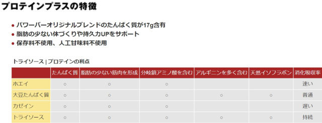プロテインプラスには「トライソースプロテイン」という独自の配合によるたんぱく質(ホエイ、カゼイン、大豆たんぱく質)が23g含まれており、筋肉の形成に必要なアミノ酸を安定供給します。