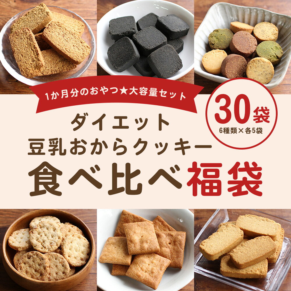 【商品名】 お試し豆乳おからクッキー 30袋(約1か月分) 福袋 【名称(品名)】 焼菓子 【名前/内容量/原材料名】 ■乳酸菌豆乳おからクッキー(14枚)×5袋 おから、小麦粉(国産)、グラニュー糖、マーガリン、豆乳、乳酸菌末(殺菌乳酸菌体、デキストリン)/乳化剤(大豆由来)、香料、酸化防止剤(ビタミンE)、安定剤(べクチン)アナトー色素(一部に小麦、乳を含む) ■竹炭こんにゃく豆乳おからクッキー(9枚)×5袋 還元麦芽糖水飴、食用菜種油、おから、有機栽培豆乳、コーンスターチ、こんにゃく、竹炭、ベーキングパウダー ■玄米ブラン豆乳おからクッキー(7枚)×5袋 還元麦芽糖水飴、おから、有機栽培豆乳、食用菜種油、小麦ふすま、うるち米(玄米粉) ■6ZERO サクサクと豆乳おからクッキー(4種×3枚)×5袋 還元麦芽糖水飴、食用菜種油、おから、有機栽培豆乳、コーンスターチ、ココア、 紅茶、抹茶 ■豆乳おからプロテインクッキー(7枚)×5袋 還元麦芽糖水飴、おから、有機栽培豆乳、食用菜種油、植物性たん白(大豆) ■かたさひかえめ マクロビ豆乳おからクッキー(7枚)×5袋 おからパウダー(カナダ・アメリカ・他)、豆乳、小麦粉(アメリカ他)、甜菜糖、食用調合油 【保存方法】 高温・直射日光をさけてください。