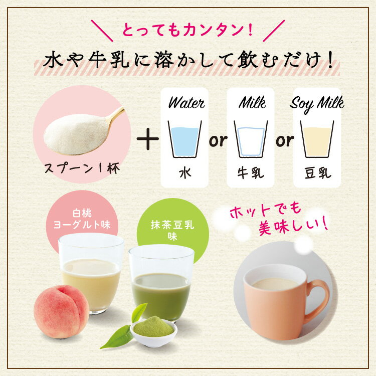 2袋とも白桃ヨーグルト味をお選びいただいた方には白桃ヨーグルト味が、2袋とも抹茶豆乳味をお選びいただいた方には抹茶豆乳味が、そして味違いをお選びいただいた方には、白桃ヨーグルト味3包と抹茶豆乳味2包がセットになっております)。