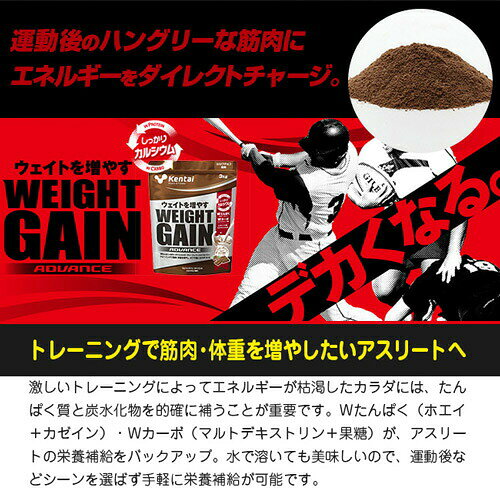 商品説明 「Kentai(ケンタイ) ウェイトゲインアドバンス ミルクチョコ風味 360g」は、競技アスリートのカラダづくりを考えたプロテイン チョコレート風味です。